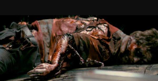 Despite the often choppy editing—most likely to disguise any flaws in the practical monster suit—this remained goretastically effective, engaging and exciting. These special effects are nothing to scoff at… actually, I was quite impressed. The blood work is excellent—and the blood splattering is kinda’ chunky! The animated bodies are disturbing, the stop-motion severed hands are a joy, and the brutal limb breaks will catch you off-guard.