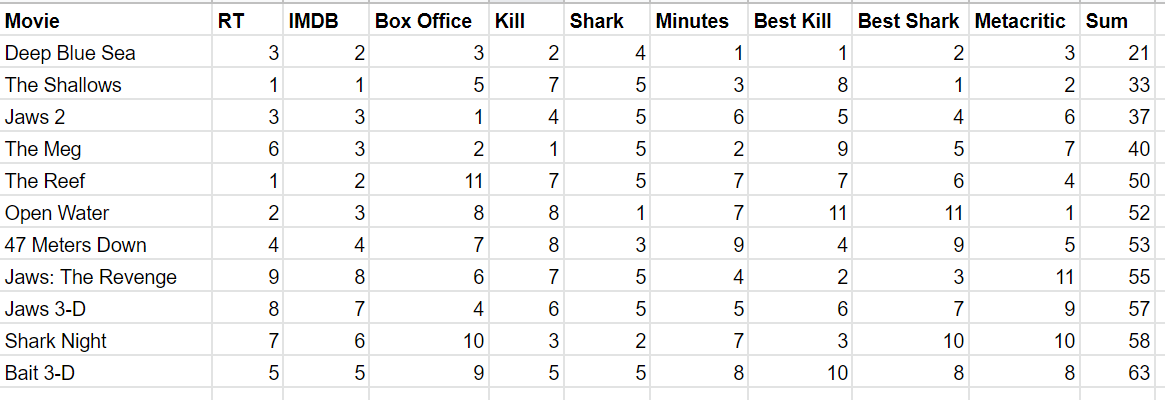 *I know there are other shark movies. I just needed to have critical (Rotten Tomatoes, Metacritic) audience (IMDb) and box office (Box Office Mojo) data to include them.