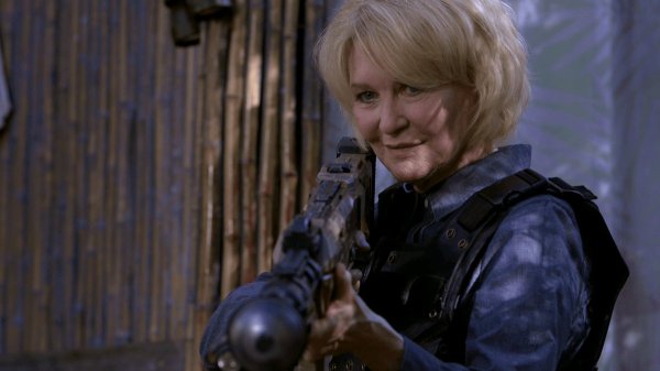 In a wacky turn of events, returning to the franchise as a different character we find Dee Wallace (The Howling, The Lords of Salem, Critters, The Hills Have Eyes) as some sort of alien surveillance operative hiding in the suburbs as an old cat lady. Turns out she’s apparently a crite bounty hunter—another element that felt shoehorned into the script. Between Dee bounty hunter and the reprising scarred-up crites, we now have multiple loose links to the 1986-1988 storyline, but still zero effort to actually connect them.