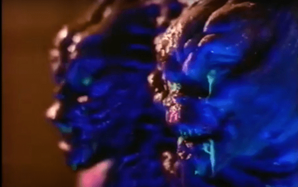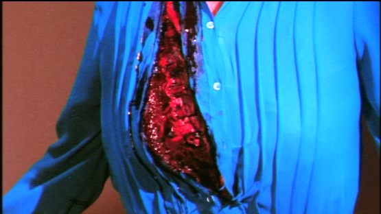 A victim is levitated and then thoracically ripped (we only see the beginnings of it so I assume they cut a bad effect snafu, but it’s still cool). And she bites open her husband’s (Marjoe Gortner: Starcrash, American Ninja 3) ribcage with her bare breasts which are each adorned with a little bitey demon face. We see quite a bit of her monster boobs. But, if you’re gonna’ make boob demons, I suppose you show ‘em, right?