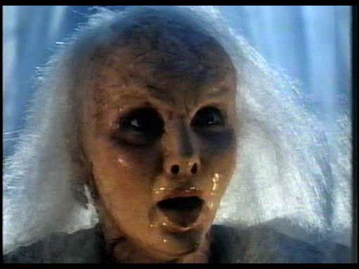 Coming as no surprise, Ruth awakens one evening looking like a pulsating, demon-voiced, slime-glazed hag in need of her fix. Upon subsequent transformations she becomes yet more monstrous (a familiar trend; e.g., Mausoleum), next appearing as some Victorian-wig-sized brain-headed mutant. And later, she develops into a gangly rheumatic Pumpkinhead (1988)-clawed polydactyl troll with a Mars Attacks! (1996) Medusa head.