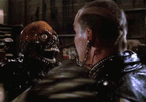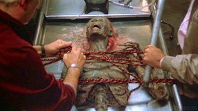 In other news, long after their exposure to the toxic gas, Freddy and Frank are very sick, and lack a pulse! So following Dawn of the Dead (1978), we have a slow zombification/transformation process as their bodies slowly die and they comically whimper.