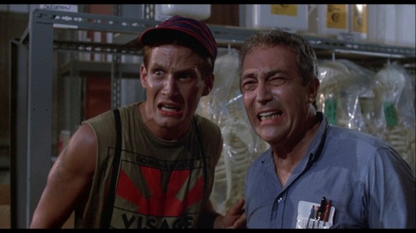 You’ve gotta’ love the comedic chutzpah to put on the screen: “The events portrayed in this film are all true. The names are real names of real people and real organizations.” Then, early in the film a character refers to the events of Night of the Living Dead (1968) as being based on a true case. It’s so cheeky. I love it. These bodies evidencing the events of 1969 reside in the basement of a medical supply company warehouse manned by two nincompoops Freddy (Thom Mathews; Friday the 13th part VI, Return of the Living Dead II) and Frank (James Karen; Poltergeist, The Unborn, The Willies, Girlfriend from Hell).