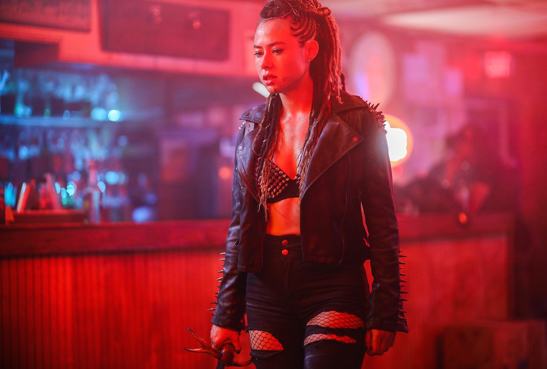 The world has crumbled and law enforcement has retreated from the cities as a new opioid crisis-era drug’s hold on its addicts has created a very fledgling-stage Escape from New York (1981) every man for himself way of life. Riots flood the city streets as our drug dealer (Travis Hammer; Dominion) sprawls across a lounge chair bare-chested under his heavily spiked leather jacket. A drug addict storms his lair only to be impaled in the head by a machete at the hands of his very Doomsday (2008)-chic underboss Gutter (Dora Madison; Bliss, Exists). Crème de la crème, right?