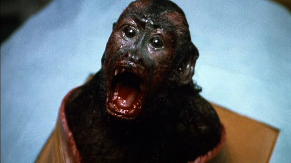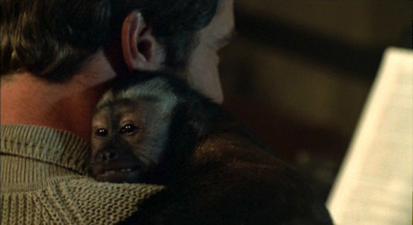 As the film advances we observe a tangle of interpersonal relationships. Trained by Melanie (Kate McNeil; The House on Sorority Row), this adorable care companion monkey is named Ella, and she immediately wins Allan’s heart (along with the hearts of viewers). As Melanie continues to train Ella with Allan, Melanie and Allan grow closer as Ella seems increasingly attached to Allan. Allan’s live-in nurse also comes to form an adversarial relationship with Allan and Ella. And Allan distances himself from his well-intended but mettlesome mother. Meanwhile, Geoffrey continues his research (including sneaking an injection of “brain fluid” to Ella) as his job comes under threat from his dean.