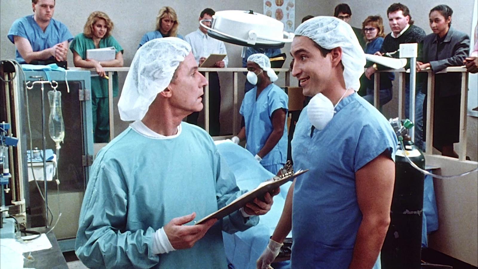 Their medical school professor Dr. Sorenson (Roddy McDowall; Fright Night I-II, Mirror Mirror 2) is in charge of the game and in touch with his players via walkie-talkies. When some players stop answering, he knows something is wrong and (of course) wanders out in the dark to investigate.