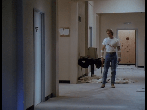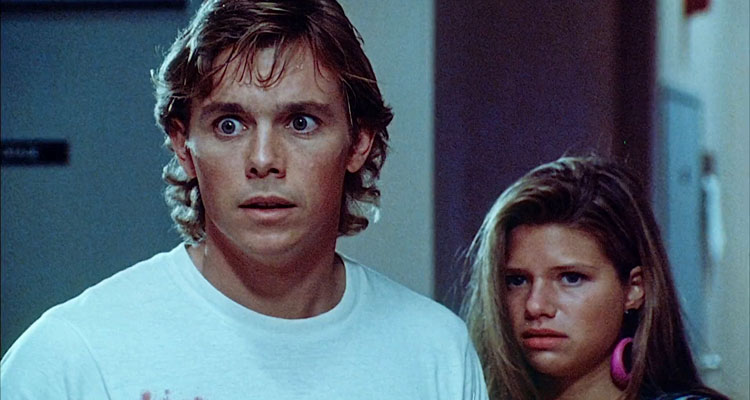 Playing a computer-modulated live-action game in their building, Sam (Christopher Atkins; Beaks: The Movie) and his med school classmates wander the hallways after hours with the lights out, armed with flashlights, trying to locate clues to make their way to “save the princess” and win the game. The only problem is that there is one more player they weren’t aware of… after a surgical procedure to control aggression in their test baboon Shakma, the animal went berserk and had to be put down. But no one had the heart to do it. Now loose and super-angry, Shakma prowls the halls with a violent score to settle.