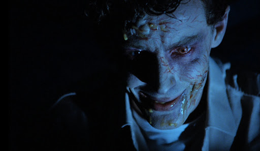 After trying on a demonic metal mask displayed in the theater lobby, a woman (Rosemary) cuts herself and transforms into a monstrous, green goo-spewing demon with gnarly claws. She gashes someone else who, after a bout of running and screaming, likewise suffers a disgusting bursting pustule, talons emerge slowly dislodging her fingernails, fangs force out her bloody human teeth, and she becomes the next afflicted “demon.” Although, however “demonic” they appear, they behave much more like faster, smarter zombies.
