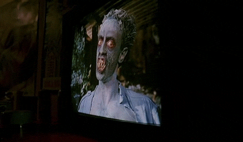 As we meet our cast of victims at a birthday party in Sally’s condo, a movie on TV muses the possibility of “another” demon outbreak, thus acknowledging the recent events of Demons (1985) directly such that we now know that “this world” understands this supernatural event actually happened. Meanwhile, several other tenants in the building are watching the movie within our movie about a group of people searching the remains of the demon outbreak of the first movie. Like part 1, the events in the movie parallel events transpiring in the condo building. After accidently being exposed to drops of human blood, a movie demon corpse reconstitutes into a gummy, gnarly-mawed demon via reverse time lapse footage and some stop-motion work. When this demon sees Sally watching the movie through the TV, it passes through the screen like in The Ring (2002) to begin hunting its fleshy fare.