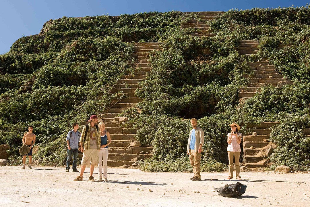 The adventure proves worth it when they approach the Mayan ruins: a vine-enshrouded pyramid. Facing a significant language barrier, the Mayan villagers are enraged when the tourists get too close to the structure, threatening to kill them by gun or arrow and forcing their retreat to the top of the ruins. Now marooned atop the structure where they find a dead body cocooned in vines, the tourists are besieged by the armed villagers who clearly will not let them leave.