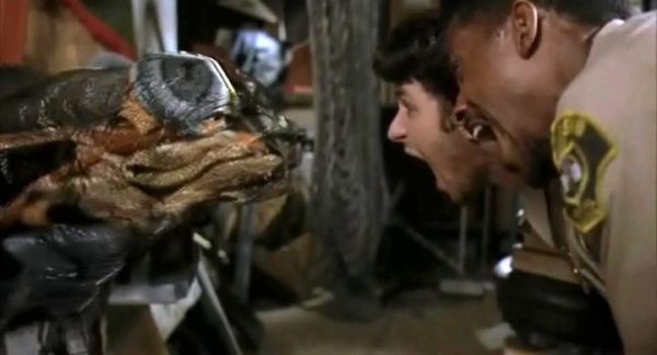 Despite being rated R, this sci-horror comes off as a rather light horror movie. Most of Max’s antics are funny as he terrorizes Lori’s boyfriend, tampers with his car’s brake line, or climbs up a tree and swallows an old lady’s mean old cat whole like a boa constrictor unhinging its jaw! And while there’s a good amount of blood, almost no flesh-rending gore occurs on-screen.