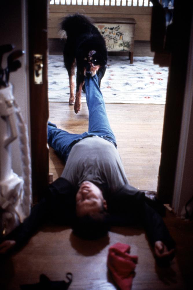 Probably honoring Cujo (1983), Max picks up a pretty gnarly open wound on his face. And we have some obvious parallels with Dr. Frankenstein and his monster—Mary Shelley’s Frankenstein (1994) feels like a good match. But even more than the blatant parallels to the family dog-turned-killer Cujo, Max and his relationship with Lori reminds me of a canine version of Seth Brundle’s “Brundle-Fly” (The Fly). Just like Seth Brundle, Max finds love and understanding before coming apart at the seams and becoming the very monster that his lost love must see dispatched in the end. The acid urine attack on Lori’s boyfriend further strongly parallels events of The Fly (1986).