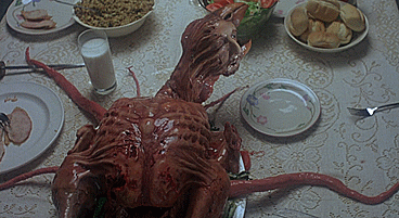 The special effects are actually pretty good! The cleaver wounds are gaping and fleshy, the blood is abundant, and then there was the dinner scene. The dinner scene is something straight out of a Freddy sequel (e.g., The Dream Child). The effects for this scene are a bit hokey, but delightful in an 80s kind of way as a turkey grows tendrils and has an unnervingly off-center human face (of Max) on the side of the turkey head which giggles at McCarthy tauntingly.