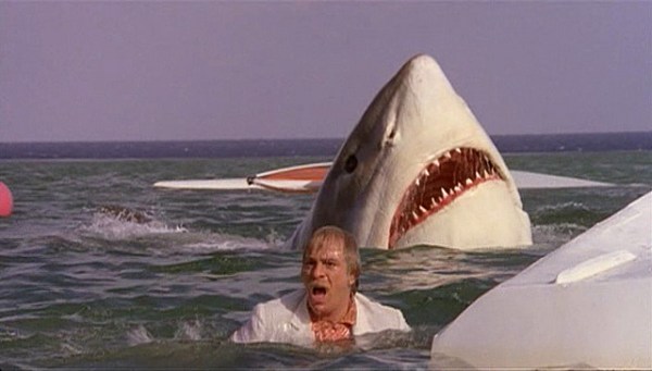 But finally after an hour we finally get to SEE something when someone is hanging from a helicopter and has both their legs bitten off! It’s bad, but it’s delightfully awesome—and it’s one of the most worthwhile scenes in this entire movie. Other highlights include pulling a man out of the water to discover he’s missing his lower half in a chunky gory mess (a gag well-utilized by the various Piranha), and the shark’s eventual defeat is a bloody underwater explosion.