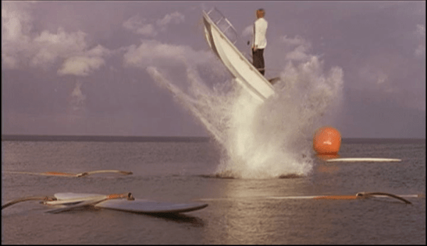 Director Enzo G. Castellari’s (Escape from the Bronx, Warriors of the Wasteland) movie starts slowly with the action, from almost none in the beginning to just a little in the middle. We do see windsurfers knocked off balance into the water, a lone severed limb, swimmers yanked beneath the water’s surface, sand the occasional comical catapulting of a motorboat and its human (or dummy) occupant into the air as if a bomb went off underneath them.