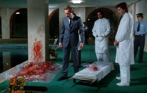 Our masked killer’s Leatherface influence is worn on his sleeve as he murders a college skinny dipper and leaves her in a bloody chopped-up poolside pile, but less one body part. The killer claims different parts of each victim. We see head and limb bloodily separated from their bodies via chainsaw, an on-screen rarity for a low budget early 80s movie. And for those who care, there is a lot of nudity, which is actually somewhat linked to our killer’s piecemeal motive. The macabre highlight is the discovery of the severed torso of a girl, doused in blood and entrails dumped out on the floor. There is even a decomposing stitched-up Frankenstein girl formed from all the stolen body parts and an utterly ridiculous crotch-ripping closing shot just for funsies.