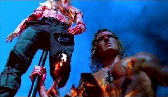 This is a film that truly celebrates its gore in the spirit of Riki-Oh (1991). The imagery is absolutely grisly as faces collapse into punched-in skulls. I could just as readily describe this movie as the intersection of the utter madness of The Toxic Avenger (1984) and the dire vengeance The Crow (1994). Limbs are ripped off and blood geysers from their sockets, lower jaws are torn from skulls, heads are impaled with cleavers, a victim is split in two down the middle, and another gets “shafted” up his, well, rear shaft.