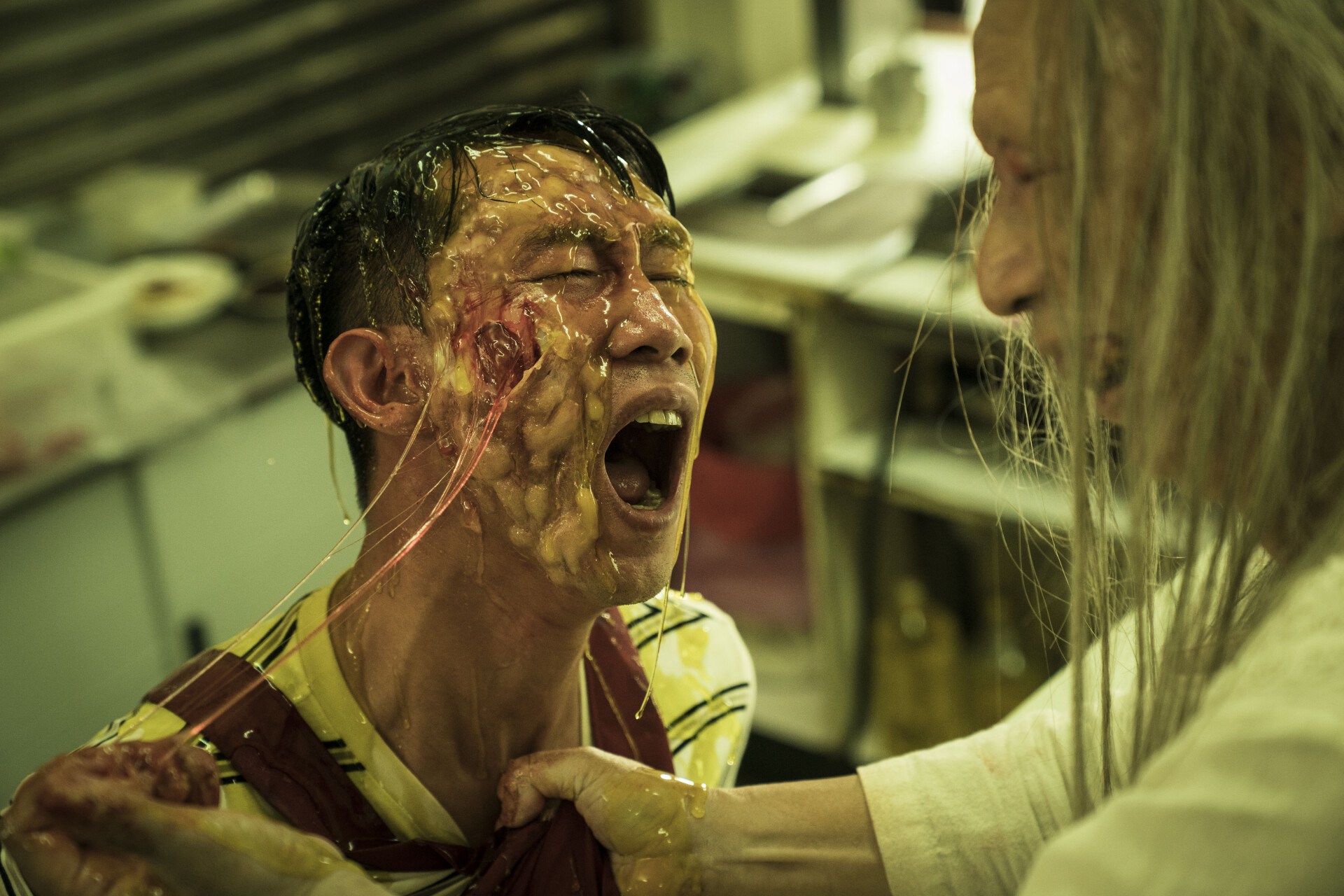 Those infected with this virus seem to access the darkest, most insidious fantasies, urges and compulsions in their subconscious and act on them, devoid of conscience or morals or social awareness. We witness someone dump the contents of an oily scalding kitchen fryer on a man’s head and then claw off his softened blistering melty flesh; we see disturbing things happen to disturbed elderly people; limb-breaking torture with a smile; throats and noses and Achilles’ tendons are viciously torn by animalistic biting; and exploding and slimy bludgeoned macerated heads! Director and writer Rob Jabbaz (Lake Bodom) does well making us feel it when innocents suffer.