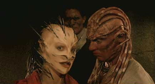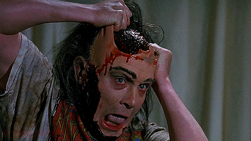 This film pulls no punches. We see a man slice open his own face and peel his scalp from his sinew-covered skull while screaming and holding chunks of hairy scalp in his desperate hands. Latex wound work is graphic, mangled and oozy. The monsters come in all shapes and sizes like a horror Star Wars cantina, with all manner of mask and face make-ups, prosthetics, odd appendages, some amorphous, even some puppetry.