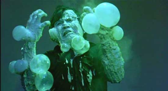 But truly, the silly, dumb and nonsensical shifts hard into gear once we are introduced to the black magic practitioner and his undead bony pet bat. There are stop-motion bat skeletons, a cursed man appears to be covered in paste and balloon-pustules, a goopy guts-covered skull gives hacky-sack spiders a stinger and proboscis, the corpse of a murdered Buddhist holy man guides Hung, Hung literally vomits a live leopard eel, and the black magician eats guts and vomit in order to conjure a slimy disembodied goblin head from some gross gobbeldygoop.