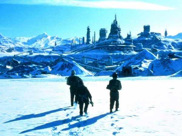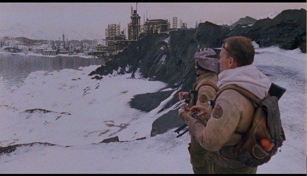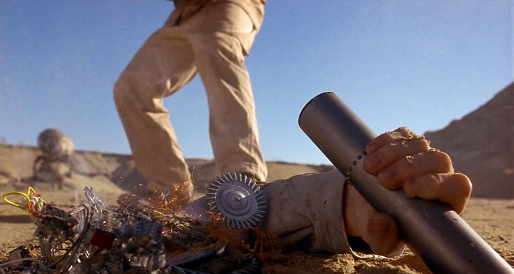 These delightful little mecha-fiends scream as they whiz through the sand like moles on steroids, then leap at their targets scything off limbs with their mini-buzzsaws. They’re like a cross between a Phantasm (1979) flying sphere and a humorless graboid from Tremors (1990). Considering this came out within a couple years of Starship Troopers (1997; $105 million budget) and five years after Total Recall (1990; $65 million budget), the special effects and set design budget seems especially humble (considering the $20 million for the entire film). Despite this, which would normally be a major visual shortcoming, I find that this movie tells a great, even if simple story very effectively. Peter Weller leads the narrative well, some nicely illustrated backgrounds of the apocoscape give character to Sirius 6B, and the charming stop motion screamer variations make me smile.