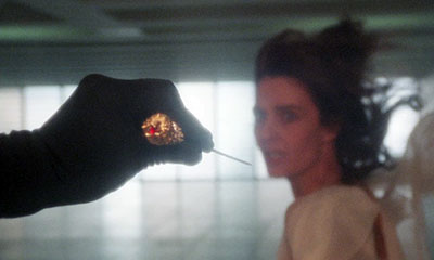 In proper giallo form, our killer POV shows his extended, gloved hand as he chloroforms his dance student victim and slowly punctures her breast and ribs through to her lung with an ornate hair needle. For so little blood during this almost peaceful murder, it actually struck me as very tense and graphic.