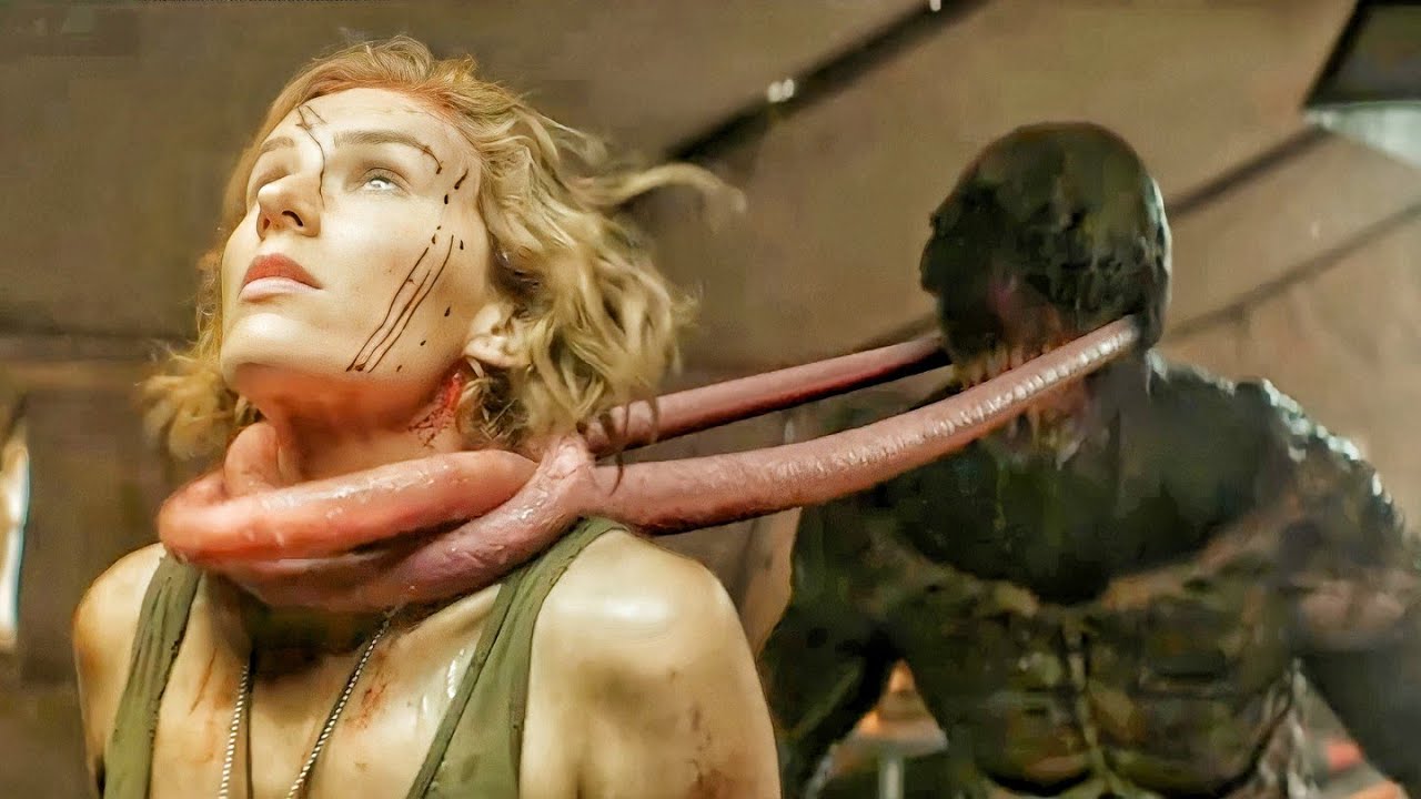 Our monsters look monstrous, but move entirely like people with chafed inner thighs. I actually found this annoying. They scurry from one point of gunfire cover to another in the battlefield, they apparently have a clumsily haphazard 20’ vertical jump that feels really forced on viewers’ suspension of disbelief, and basically every time they swipe a big gnarly claw at a soldier he’s dead. So the action is kind of basic. And the monsters seem way too wisely tactical despite still roaring with their arms widespread like idiots and behaving otherwise like, well, feral quasi-intelligent monsters. They kind of feel like generic brand Resident Evil (2002) monsters—like bipedal “lickers” with twin-prehensile tongue-tentacles. Director Neil Marshall (Dog Soldiers, The Descent, Hellboy) has a strong history making movies with engaging monsters, but this is not one of them.