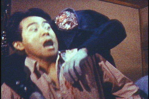 Truth be told, this zany flick does a good job honoring Evil Dead, but other influences are also apparent. Severed body parts rebel and attack. A hand and foot fuse (much as in Frankenhooker) to kick the crap outta’ Shinji, a severed hand makes the disembodied head mobile (much like the antics of Bride of Re-Animator), and projectile prehensile intestines smack of the Re-Animator (1985) finale. Some cheap Claymation reconstitutes a skeleton into a horribly misshapen melty-faced horror that is laughably awesome.