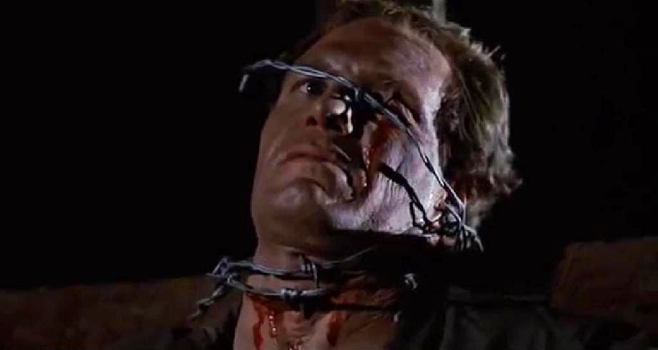This movie is actually pretty well made… I was expecting something hokier and cheesier. The gore gags are pretty good, visceral and graphic. Victims are hung like scarecrows and gutted like turkeys, with Bert getting stuffed with the stolen cash and then sewn back up, only to become some sort of scarecrow zombie himself. Bloody limb-sawing and gushy face stabbings ensue as the scarecrows pick off the criminal team one by one. Panic sets in and wild hypotheses form. Are these scarecrows zombies? Were they supposed to land here after the heist? Are Corbin and his team dead and being punished in Hell?