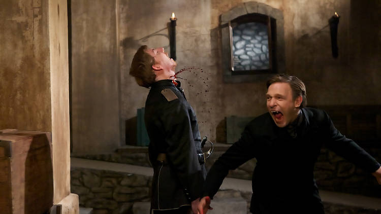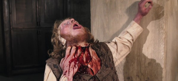 But boobs are not the only cause for eye-rolling laughs. We see friendly curious wolves on screen frolicking about the forest while hearing the obviously mismatched sounds of snarling and growling; a skull-splitting shovel to the head represents the best gore; and a feral peasant biting a man’s ear is more convincing than when Dracula first bites a neck.