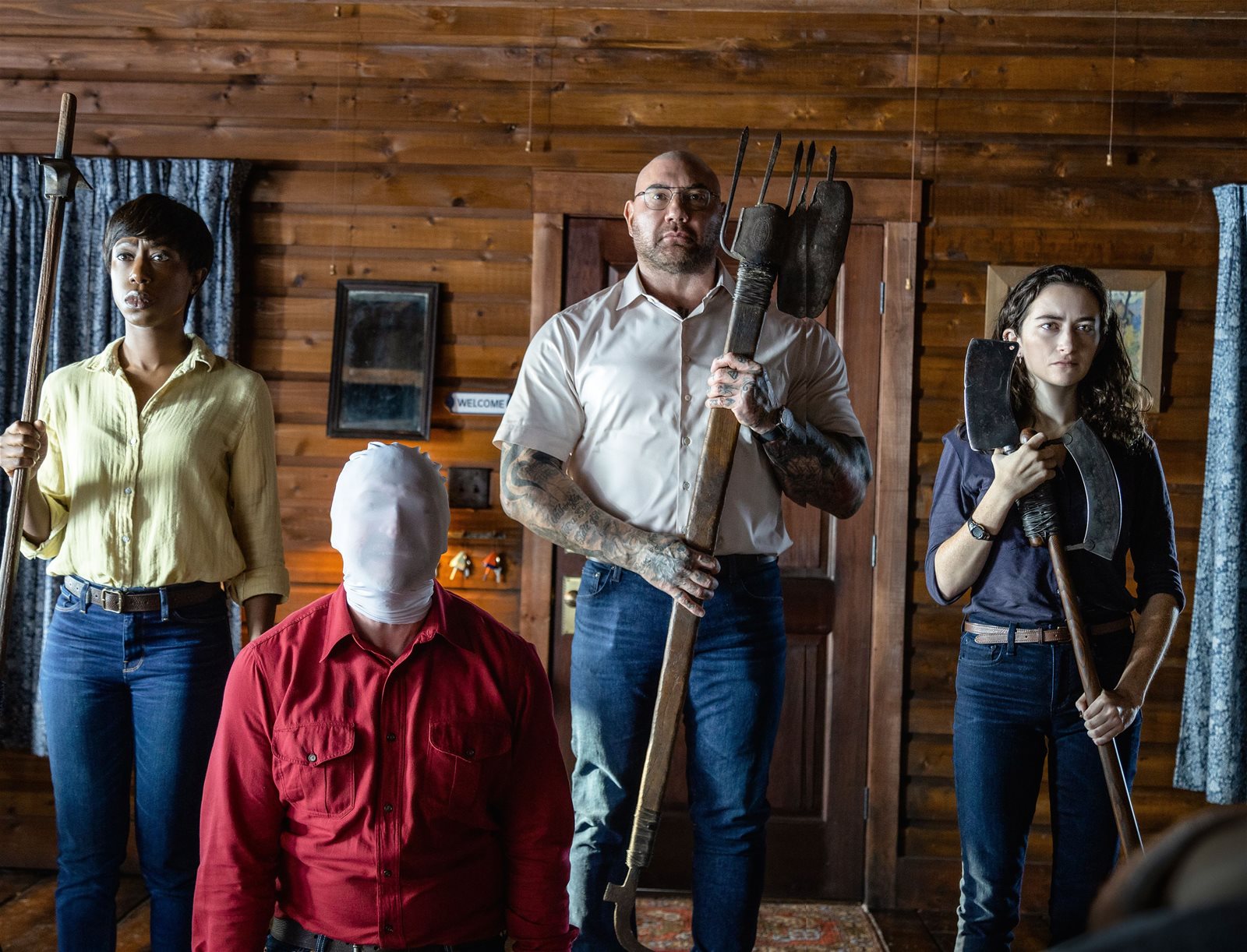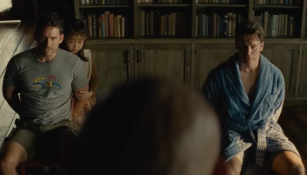 Opening shots of a beautiful pristine forest introduce us to a little girl Wen (Kristen Cui) catching grasshoppers in her jar-terrarium and assuring them “it’s okay, relax, I’m not going to hurt you, I’m just going to learn about you for a little while.” The movie wears its paralleling intentions on its sleeve, as we will be doing the very same to our cast of morally conflicted characters in this stressful cabin just as Wen would—though with more innocent intentions—to her grasshoppers. The movie wastes no time. Just as we find ourselves fondly smiling at Wen’s love of nature and fart jokes, a large man ominously approaches from a distance through the trees.
