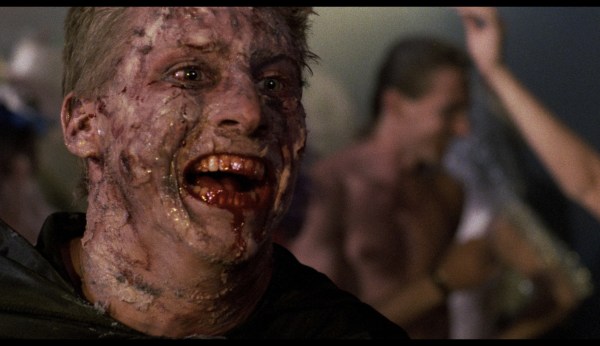 College journalist Sam (Patrick Lowe) plans to break into an on-campus animal-testing lab to get a story. Sam’s friend breaks in (on Sam’s behalf), is bitten by a test subject baboon, and gets sick. The virus spreads by bite… and even by first date hickey. Victims become wildly violent and ill-tempered. Their skin looks sickly with lesions and boils, they drool, they become stronger from the adrenaline rush, they become furiously homicidal—everything you’d expect from a rage virus movie. They even get somewhat zombie-ish. Before 28 Days Later (2002), Resident Evil (2002) and The Sadness (2021), there was Primal Rage with its much lower budget 80s rage virus.