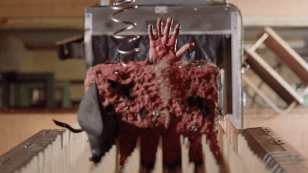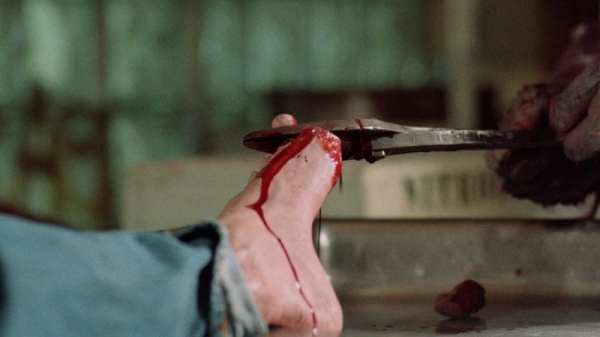 The “face in acid” death scene offers a deliciously gory melted face payoff along with some hokey lines. The on-screen “brain drill” death was decent. But the on-screen bonesaw-to-the-face was peak awesome for the movie—probably the scene that earned Kristin Davis her iconic Sex and the City role. And while not a death scene at all, the toe-cutting scene may be the most brutal and impressive of all! Just WOW. Also watch out for the cartoonish meat grinder gag.