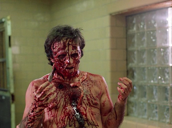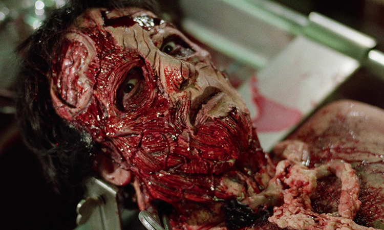 This movie wastes zero time before introducing the mangled gore. The autopsy scene occurs in the first five minutes of the movie and we see Mitch’s partially skinless face, muscle fibers and brain exposed, a blade impaled in his neck—like something out of Hellraiser (1987)! His hands are awesomely gashed and necrotic.