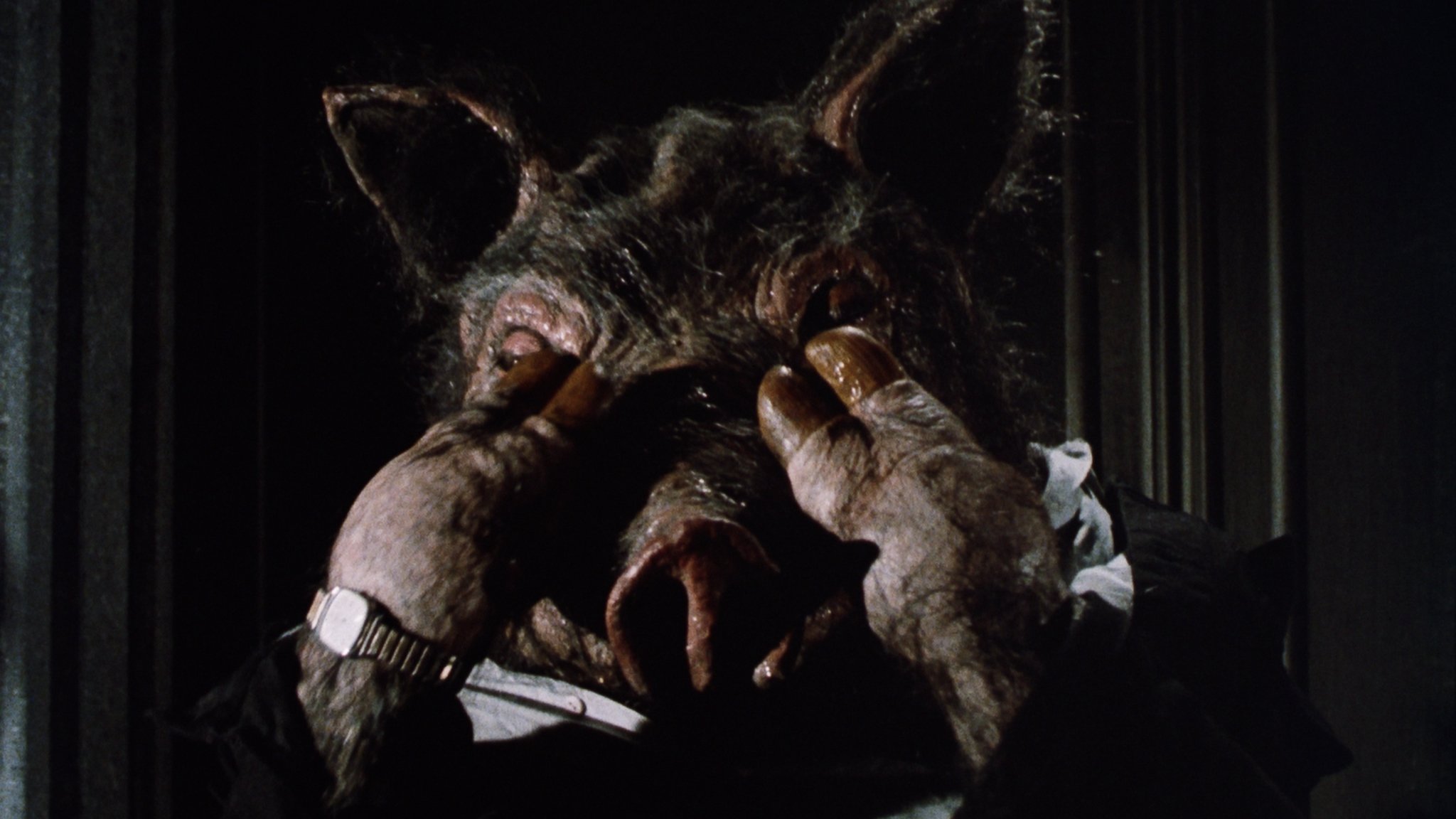 The first death is woefully bad. A car just explodes to no satisfaction of any viewer who enjoys death scenes. A lame deadly fall likewise falls flat. But thankfully things quickly get interesting when a goblin-like statue and a grand wooden chair come to life and kill the intolerable French woman. Yet more fun, the basement is a crypt full of the groaty living dead. There’s even a transformation scene of a werepig. Yes, were-pig! That’s right up there in the wacky category with the werepanther from Waxwork II (1992)! This werepig transformation is easily the coolest and most elaborate effect of the movie.