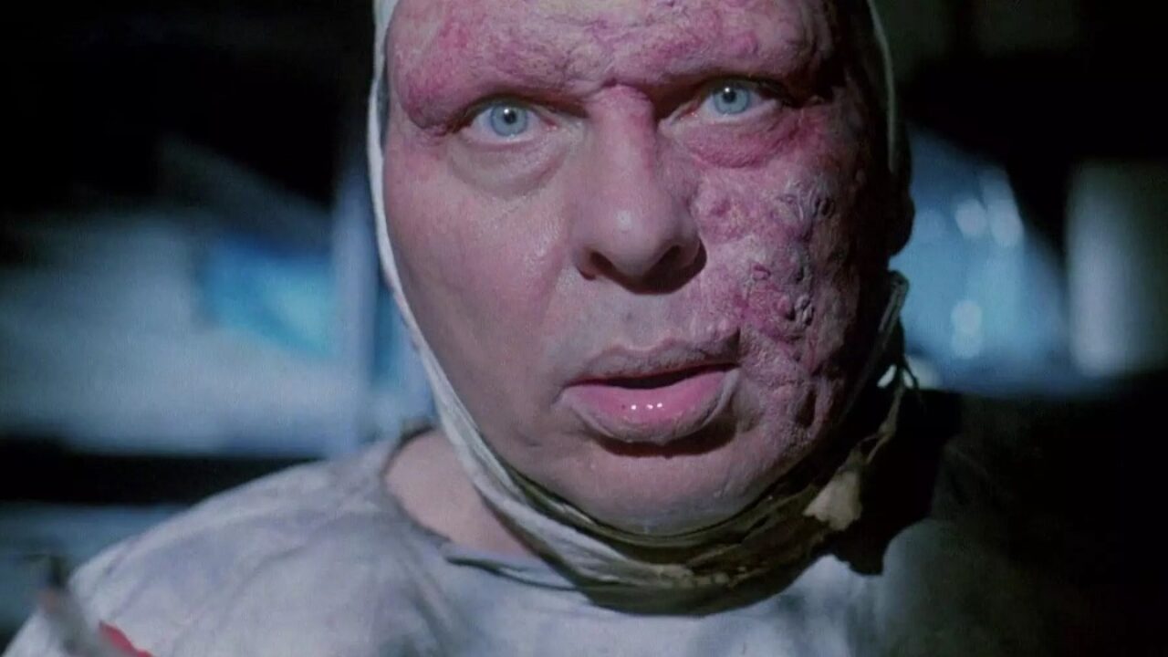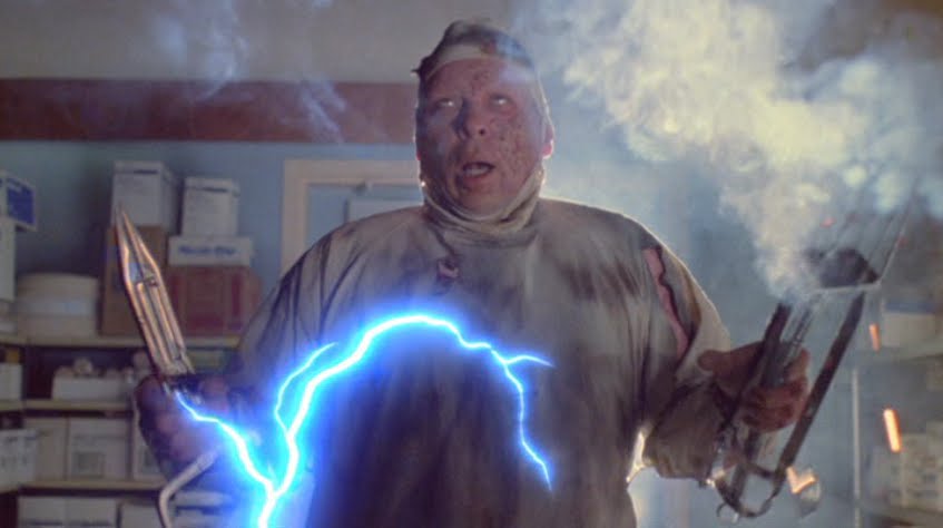 Of course, there was at least one great big gore gag: the morgue birth scene! And hold on, the movie gets yet gorier and more wild as it progresses into the third act. Graphic self-surgery, a vein-popping blood pressure-cuff choke-out, a dash of electrocution and latex-worked face mutilation, and a wild finale death scene with the cheesiest line yet of the entire movie!