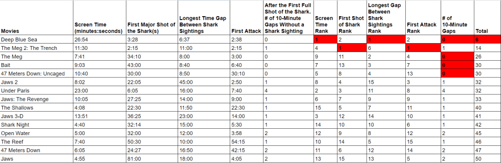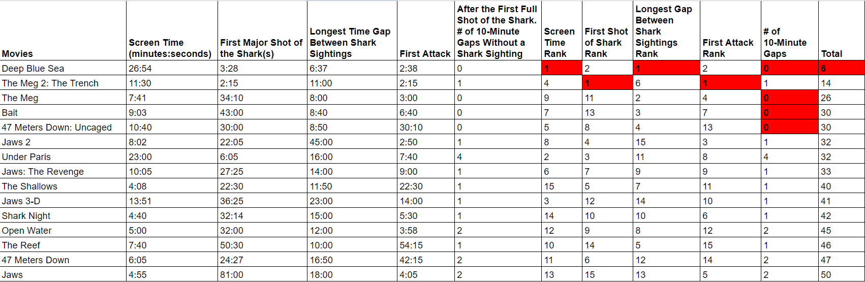 I created a ranking system to see which theatrically released shark movie is the MOST shark movie. The movie with the lowest amount of points wins because it typically ranked #1-3 in every category.