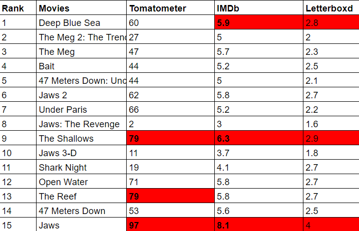 11-15 ranked movies – Shark Night, Open Water, The Reef, 47 Meters Down, Jaws