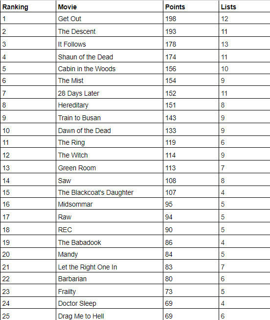 If you’ve followed Movies, Films and Flix for a while you know that we love horror movies, ranked lists, and movie math. It’s been a while since I released an epic horror list so I recruited 21 MFF website and podcast contributors (who love horror cinema) to submit a ranked list of their 25 favorite horror films released since 2000. I then created a point system (the #1 movie gets 25 points, and the 25th gets one point) and added them all together to create a super list. Putting this post together has been a lot of fun because I genuinely didn’t know which films would be included and what the overall #1 film would be. The lead changed many times and it was thrilling when a new list arrived that shook up the rankings and maybe pushed a film out of the top 25. Overall, I’m really proud of this list (Green Room could be higher ranked though) and I think it showcases a wide range of horror cinema released since 2000. After reading the list, make sure to send me your picks.