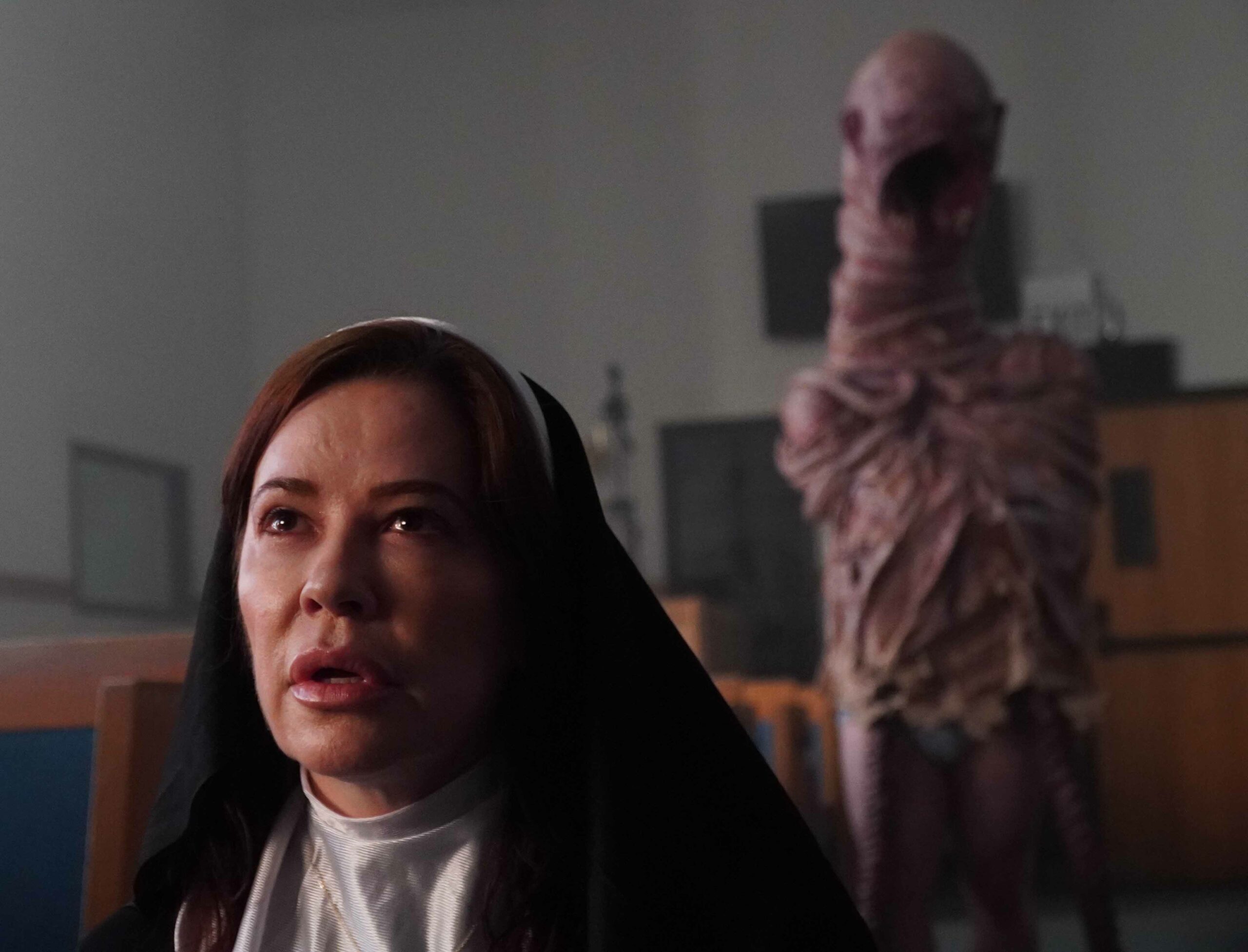 The imagery is often as graphic (and quite provocative) as the limited budget permits. There is some very low budget CGI—like, laughably silly low budget. But this CGI is complemented by maximum effort latex monster makeup, like when Slater’s neck monstrously elongates and he eats an orderly’s face. Likewise, some of the writing (e.g., Slater’s monologues) is most thoughtful, whereas the execution of other scenes (e.g., possessed mobs of patients) is forgettable B-movie fodder. This movie is clearly self-aware of exactly what it is. But, at times, it still aims a good bit higher and, frankly, pleasantly hits above its weight class at times.