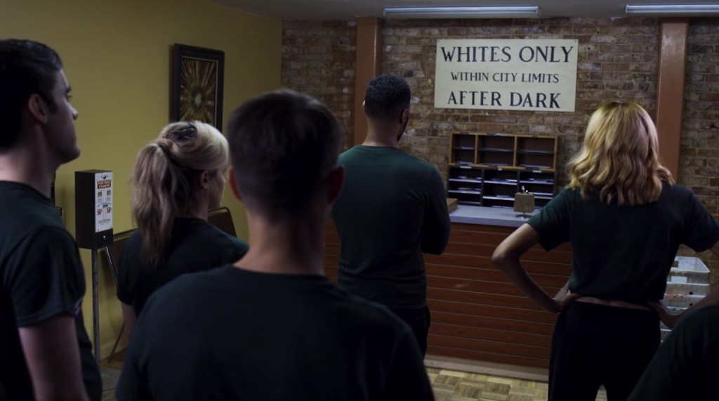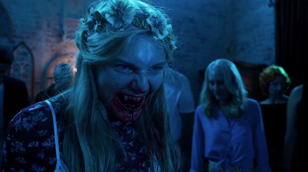 Sundown—A campaign team for a black West Virginia political candidate find themselves stranded in a historically racist “sundown town” after dark. The creepy fiddle-playing mayor (Peter Stormare; Constantine) leads them to an evening dinner party with a questionable main course. This was the most fun segment, as it was horror-comedy and decently executed despite a painfully limited budget for the almost-all-off-screen action and gore.