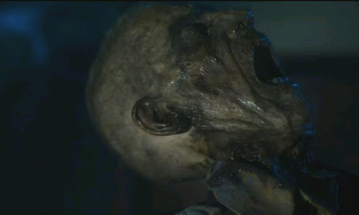 But thank the Gods, when they stumble across the first dead body of the ship, the efforts in the gore department are promising. The dead bodies all look very differently mangled, very horrific, and very well done. Further exploration reveals chain-bound sarcophagi with stone etchings of skulls and bones. Of course, expecting gold or some other treasures, they break they chains and open them up to find monsters.