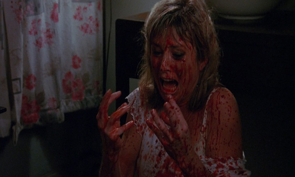 Once fully formed, this monster looks awesome! As far as rubber monster suits of the 80s, this ranks really high. As if laughing at its own lunacy, this massive monster basically teleports through the household plumbing of its creation to terrorize the brothel inhabitants and pick them off one by one with its hook-like limbs and prehensile umbilical cord. The first death scene is a brutally sloppy decapitation. However humble the budget, the gore and creature effects are ample. And, totally inexplicably, the end scene features a crazy gore-slathered face-melting scene.