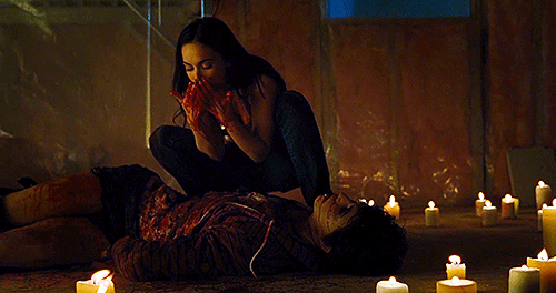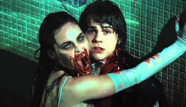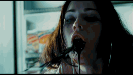 Actually, other aspects of this soul-devouring demon movie follow the tenets of vampirism. Jennifer has a frightful ghoul-like transformation phase (after emerging from her natural death) during which she projectile vomits evil ichor after trying to eat regular food; she uses sexuality to lure male victims to their demise (much as many monsters of folklore and mythology); she becomes invigorated and indestructible (i.e., regeneration) and looks vibrant after feeding, but looks anemic and weak when hungry; and she possesses a sensual love for her best friend.