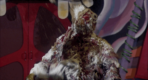 The clown themes are thorough. They shoot popcorn rifles, throw acidic pies (in the now-melting face) and craft balloon animal tracking dogs. They encase victims’ bodies in cotton candy cocoons and drink their sweetened blood with super curly straws. They perform shadow puppets and eat people with them (yes, with the actual shadow puppet).