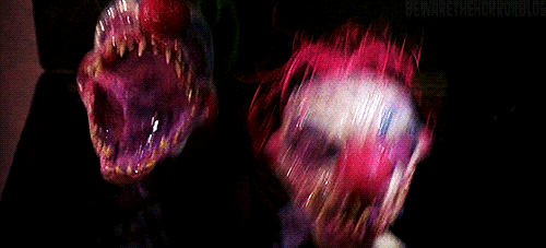 And much in the way Gremlins (1984), Critters (1986) or Hellraiser (1987) gave each of their monsters a slightly different look and personality, so does Killer Klowns. But being that these are larger creature effects than rubber monsters or hand-puppets, I find the artistic endeavor much more ambitious here. Even if the action is hokey (and often deliberately so), the special effects are great! These clowns are grinningly silly demonic fiends with pretty impressive latex work. Much nuance went into the Klowns’ faces and hair to make them unique, and their eyes and mouths are awesomely realistic—the teeth especially.
