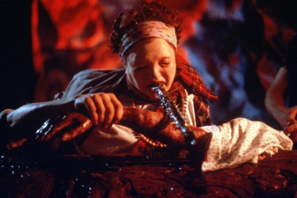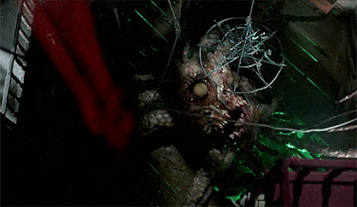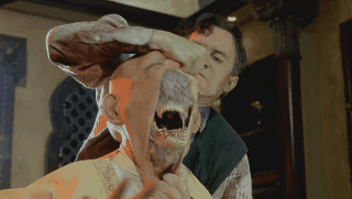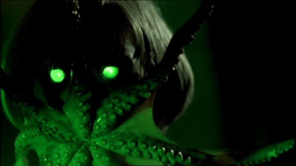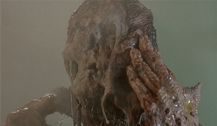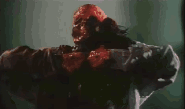 We enjoy a diversity of engaging special effects. Guts are regurgitated, tentacles emerge from mouths and from eyes and the floor itself, there’s a huge slimy tentacle monster, a spectacularly gross and chunky melting death scene, an offal pit of slippery bloody body parts, a gooey animated corpse with a gross hollowed out head, brain-bellied flesh-bat monsters, an awesome flesh-peeling face-rip, and all sorts of blood and gore. It’s really a blast for gorehounds and fans of old school practical effects.