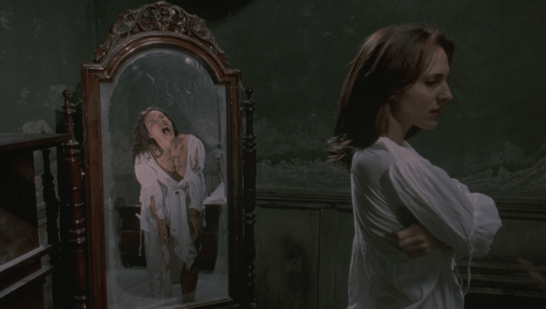 The tropes rain down hard. Kris’ car won’t start for no good reason at all, a mirror casts twisted evil reflections that don’t lead to anything at all, a child’s voice whispers through the halls of the abandoned house, and a weird harbinger lady warns Kris “believe me, you don’t want to go to that house… Death’s in that house!” Ooof!