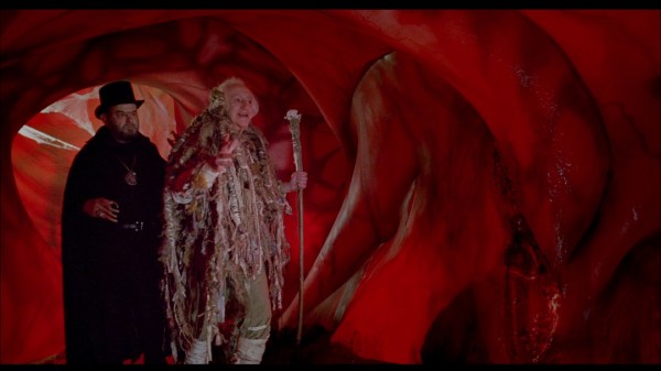 The moment they lay a naked woman down to offer to Joe, I knew what this reminded me of… the old Udo Kier schlock film Blood for Dracula (1974). This is every bit as hokey—but not nearly as good. Joe cuts off a slice of the woman’s butt cheek and feeds it to her. Yup, that’s the kind of film you’re watching. There’s quite a bit of nudity pandering to our lecherous Joe, including a blood-deluged sex scene, a topless crucifixion, very graphic penis-eating crotch cannibalism, and naked dancing witch rituals. Then, Joe is summoned to “blood Hell…” or perhaps it’s inside of a giant uterus. I really don’t know what’s going on here. The ruler of this under-realm is dressed like a dreadlock hairball and smiles goofily like he’s been vaping THC. Seriously, what am I even watching?