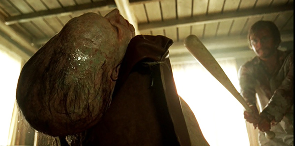 Opening caption: “Between 1945 and 1962 the United States conducted 361 atmospheric nuclear tests. Today, the government still denies the genetic effects caused by the radioactive fallout…” What follows is a scene more brutal than both of Wes Craven’s The Hills Have Eyes films combined as a team of researchers are pickaxed to death by a hulking deformed man. It’s pretty entertaining when an impaled victim is stuck on the pickax and the mutant just swings it back up in the air to slam him down yet again. What follows is a propaganda-like medley of bomb-testing clips and images of deformed children. Needless to say, you get a good idea of what you’re getting into in the first five minutes.